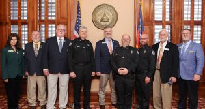 Senate photo Left to right: Police Officer Terry Palmer Jr. (front), Assistant Chief Ryan Ledford, Chief Danny Cloutre, Senator Larry Walker III, Senator Bo Hatchett, President of North Georgia Mountains Lodge 112 Fraternal Order of Police Michael Palmer, Mayor Franklin Brown
