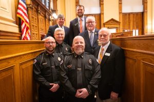 House photo left to right: Representative Kimberly New, Retired GA Department of Natural Resources Officer Al Crews, President of North Georgia Mountains Lodge 112 Fraternal Order of Police Michael Palmer, Chief Danny Cloutre, Representative Victor Anderson, Police Officer Terry Palmer Jr., Assistant Chief Ryan Ledford, Mayor Franklin Brown, Representative Clint Crowe.